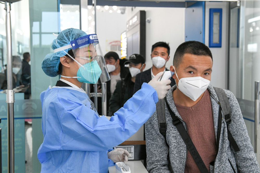 4月26日,在呼和浩特白塔国际机场国际航站楼出境大厅,机场海关关员为搭乘包机的旅客测量体温。 新华社记者 贝赫 摄