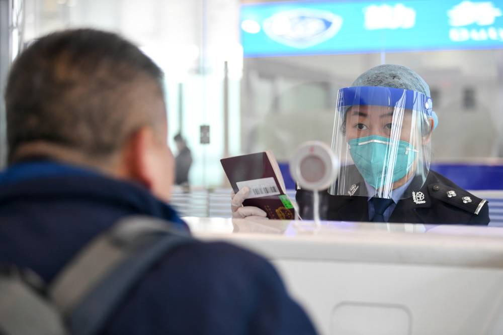 4月26日,在呼和浩特白塔国际机场国际航站楼出境大厅,呼和浩特出入境边防检查站工作人员对搭乘包机的旅客进行人证核验。 新华社记者 贝赫 摄