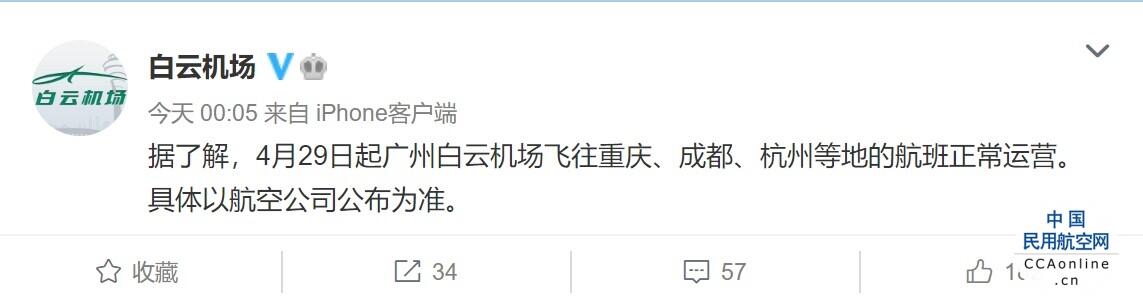 白云机场:今起白云机场飞往重庆、成都、杭州等地的航班正常运营 机场头条 航线航班 22年4月29日 编辑 通讯员mk 取消关注 关注 私信 白云机场29日0时发布消息:据了解,4月29日起广州白云机场飞往重庆、成都、杭州等地的航班正常运营。具体以航空公司公布为准。 广州白云机场