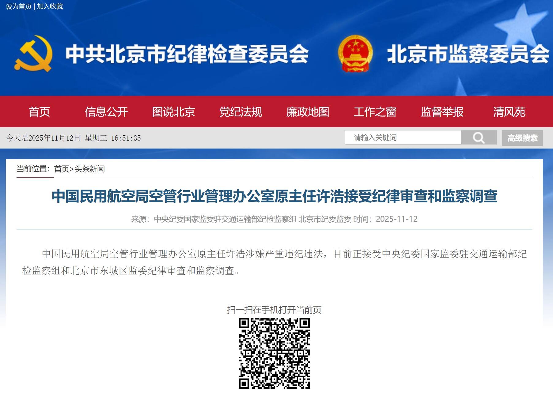 中国民用航空局空管行业管理办公室原主任许浩被查 空管头条 民航反腐 22小时前 编辑 通讯员mk 取消关注 关注 私信 据中央纪委国家监委驻交通运输部纪检监察组、北京市纪委监委消息:中国民用航空局空管行业管理办公室原主任许浩涉嫌严重违纪违法,目前正接受中央纪委国家监委驻交通运输部纪检监察组和北京市东城区监委纪律审查和监察调查。 许浩,男,曾历任民航东北管理局副局长、民航新疆管理局局长、中国民用航空局空管行业管理办公室主任。 相关推荐: 特朗普喊话空管员:须立即返岗! 国货航原总裁姚军被查 民航反腐中央空管办