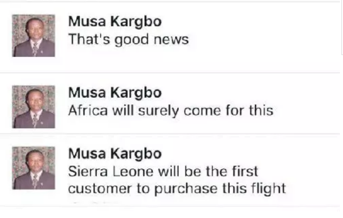 而对于中国国产大飞机,非洲网友表现出超乎寻常的热情,一名塞拉利昂网友在脸书上连发三条留言,他兴奋地写道:“这是好消息”、“非洲肯定会来买的”,等等。