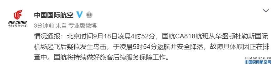 国航:CA818起飞后疑似发生鸟击 已安全降落 新闻 要闻 19年9月18日 编辑 ccaonline.cn 取消关注 关注 私信 9月18日,国航微博发布CA818航班情况通报。北京时间9月18日凌晨4时52分,国航CA818航班从华盛顿杜勒斯国际机场起飞后疑似发生鸟击,于凌晨5时54分返航并安全降落,故障具体原因正在排查中。国航将持续做好旅客后续服务保障工作。 国航
