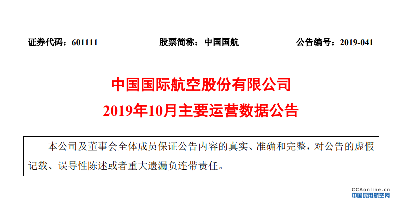 国航近日发布2019年10月主要运营数据公告,公告显示2019年10月,中国国际航空股份有限公司(以下简称“本公司”)及所属子公司(以下简称“本集团”)合并旅客周转量(按收入客公里计)同比、环比均有上升表现。