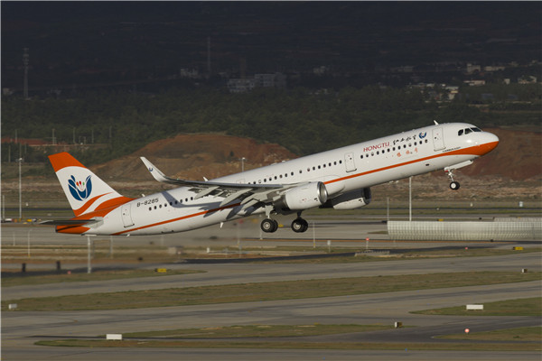 红航空客A321飞机从昆明起飞 摄影:刘聪