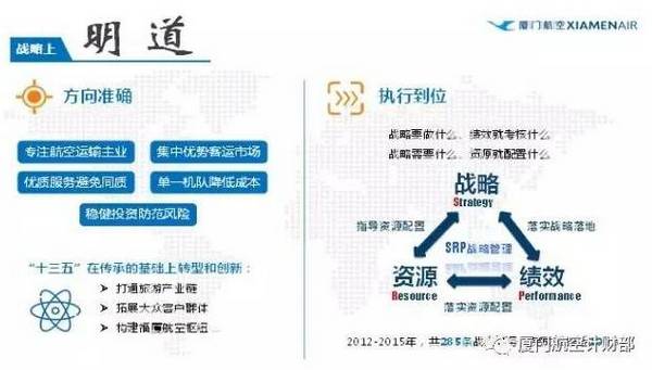 厦航有一点我觉得值得骄傲和欣慰的就是,在选择适合自己的市场定位、机型选择和服务模式等方面后不折腾,而且扎实稳步推进,这也许是厦航长期坚毅、精进这种务实推进的文化熏陶的结果。我们在战略落地上,主要是要做了两件事,一是战略需要什么、资源就配置什么,二是战略要做什么、绩效就考核什么。厦航在民航业内首创了“战略Strategy-资源Resource-绩效Performance” SRP战略管理体系,以战略为导向配置资源、指导部门行动,以绩效为手段推动战略落实、监控资源配置,三者相互支撑形成闭环管理体系,将公司总体战略逐层分解成为专项规划、年度计划、关键任务。2012-2015年,我们共分解出285条年度战略任务,每年完成率均接近100%,如加入天合联盟、B787宽体机引进、开辟洲际航线、收购河北航空、成立江西航空等大事、难事均得到有效落实。“十二五”厦航取得辉煌业绩,除战略规划制定好,很重要一点就是利用SRP使战略落实好。