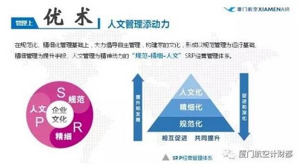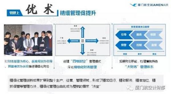 其次是精细管理促提升。如果说规范化管理是厦航的“立家之本”,那么精细化管理则是“兴家之术”,是引导企业管理从优秀走向卓越的关键。1998年起,厦航开始推行精细化财务管理,以财务管理为核心、战略规划为引导、预算绩效为手段,全面推进财务管理精细化。厦航始终坚持在精耕细作中向管理要效益,做业务驱动型财务,使财务管理与生产经营管理融合在一起,构建了从广度上不断拓宽财务管理领域、深度上不断挖掘管理价值、高度上不断提高站位、时间上不断前移关口的“四维时空”管理模式,并形成了厦航特色“大财务”管理体系,为厦航持续盈利做出了重要贡献。后来,我们逐步将精细化管理的创新成果,扩展到了整个生产、经营、管理领域,在每个部门、每个环节、每个岗位,都把精细化管理作为核心的管理理念,形成了精密运行、精致服务、精准定位、精抓细管等管理办法。规范化管理和精细化管理已成为厦航的看家“法宝”,先后荣获国家级企业管理现代化创新成果二等奖。