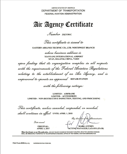 中国民用航空网讯:2017年4月6日,东航技术西北分公司(以下简称“分公司”)收到来自大洋彼岸美国FAA(美国联邦航空局)的维修许可证,标志着分公司正式成为FAA体系下认证的合格维修单位。