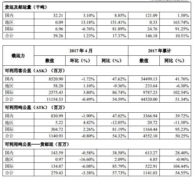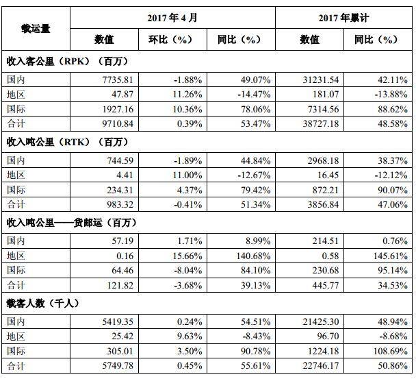 2017年4月,海南航空股份有限公司(以下简称“本公司”)及所属子公司(以下简称“本集团”)合并主要运营数据如下: