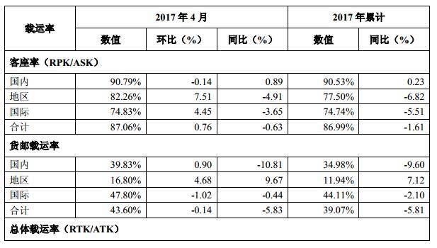 10、总体载运率指以收入吨公里除以可利用吨公里所得的百分比。2017年4月,本集团引进6架B737-800飞机,1架E190-200飞机,退租1架B737-800飞机。截至2017年4月底,本集团合计运营353架飞机。2017年4月8日起,本公司新增三亚-罗勇(芭堤雅)航线(每周3班)。