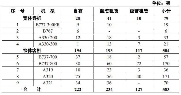 因公司于2017年2月初完成向东航产投转让东航物流100%股权,公司机队数据不再包含东航物流下属控股子公司中货航运营的货机数据。截至2017年6月末,公司飞机机队情况如下: