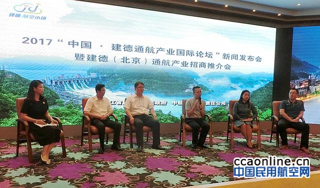 中国民用航空网讯:8月17日,“中国建德通航产业国际论坛”新闻发布暨建德(北京)通航产业招商推介会在北京举行。建德市委副书记、市长朱欢,建德经济开发区(航空小镇)管委会党工委书记尤荣福,副市长夏喜生出席新闻发布会。本次邀请到中航工业集团、中航材集团、中航文化等30家企业及国家部委单位、浙江省、杭州市驻京办,北京浙江商会、杭州商会代表、专家学者、中央、省市级媒体等100余人参加。