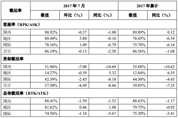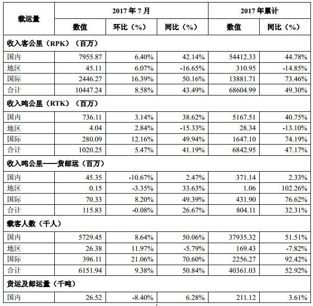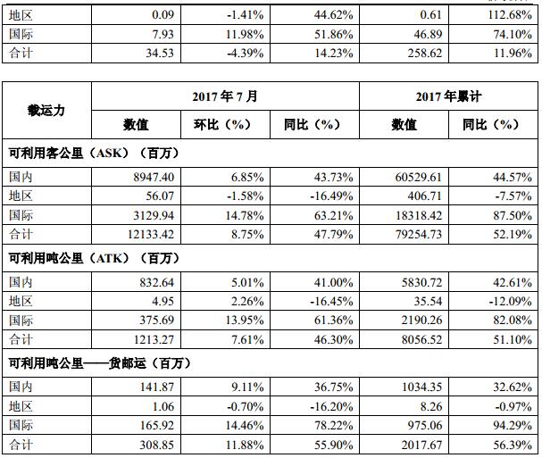 2017年7月,海南航空控股股份有限公司(以下简称“本公司”)及所属子公司(以下简称“本集团”)合并主要运营数据如下: