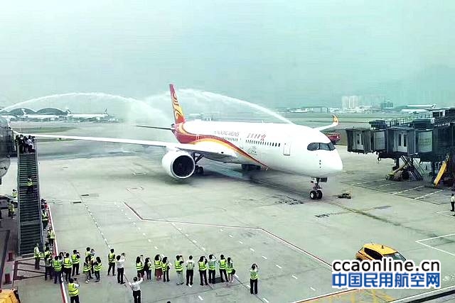香港航空由首架 A350客机运作的HX350航班在一众主礼嘉宾的见证下,于下午3时50分降落香港国际机场,随即进行了水炮欢迎仪式,祝贺公司扩大机队规模,将航线网络由区域拓展至国际。随着A350客机陆续付运到港,公司将善用其长途性能,把握香港四通八达的地缘优势,加快国际化部署,特别是发展远赴至北美、欧洲主要城市的航线,以及探索和开发尚未有直航航班的航点,配合香港及华南区域旅客的出行需要。