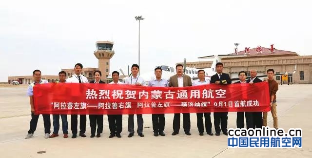 中国民用航空网讯:2017年9月1日,内蒙古通用航空股份有限公司阿拉善盟内航线首航仪式在阿拉善左旗巴彦浩特机场隆重举行,阿拉善盟政府、阿拉善机场、中国航油及公司相关领导参加了首航仪式。10时30分内蒙古通航的“空中国王350”飞机迎来了首批乘客。伴随着发动机的轰鸣声,搭载着首航乘客的飞机从阿拉善左旗巴彦浩特机场准时起飞,开始了“空中国王”在阿拉善盟内的首个商业飞行任务。随着飞机的安全抵达,标志着内蒙古通航在盟内通用航空短途运输航线正式商业运行。
