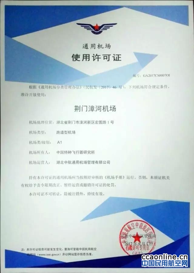 中国民用航空网讯:9月7日,湖北荆门漳河通用机场正式获得民航中南地区管理局颁发的A1级通用机场使用许可证,标志着漳河通用机场新跑道即日起将正式开放运营。A1级是通用机场的最高级别,此次取得使用许可证后漳河通用机场将融入区域航空网络,可使荆门市实现与武汉、宜昌、襄阳等周边城市的通勤互连。