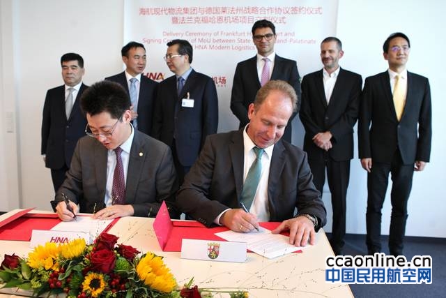 中国民用航空网讯:德国当地时间2017年9月12日,海航集团收购德国法兰克福哈恩机场(以下简称“哈恩机场”)交割仪式在哈恩机场Gross大楼举行。在当天的活动仪式上双方不仅签署了哈恩机场交割文件,海航现代物流集团还与德国莱法州共同签署框架合作协议,将在未来继续响应中国“一带一路”倡议,不断加强空港物流业务合作,并将以此为基础,通过不断拓展国际货运网络打造“中国孟菲斯”。莱法州国务秘书兼内政部副部长Randolf Stich、陕西省委常委、西安市书记王永康、中国驻法兰克福总领事馆经商领事参赞朱伟革、海航现代物流董事长兼首席执行官张伟亮等出席了当天的签约仪式。