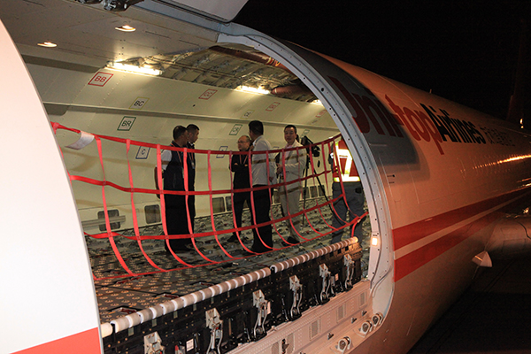 有关领导在飞机货舱了解情况 倪嘉云 摄