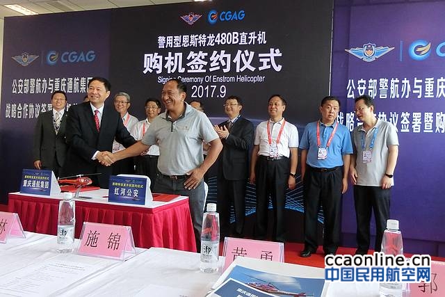 公安部警航办副主任刘道林和重庆通航集团总经理龚伟代表双方签署合作协议。根据协议,重庆通航集团将一次性优惠提供10架恩斯特龙480B直升机支持中国警航事业发展,并就整机采购、批量交付、代管服务、人员培训、机场建设、低空空域综合保障系统六个方面提供全方位的优质服务。