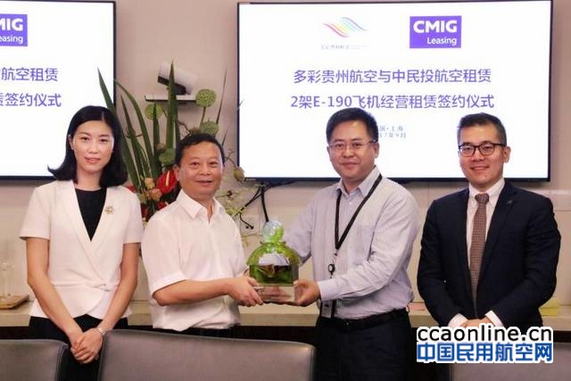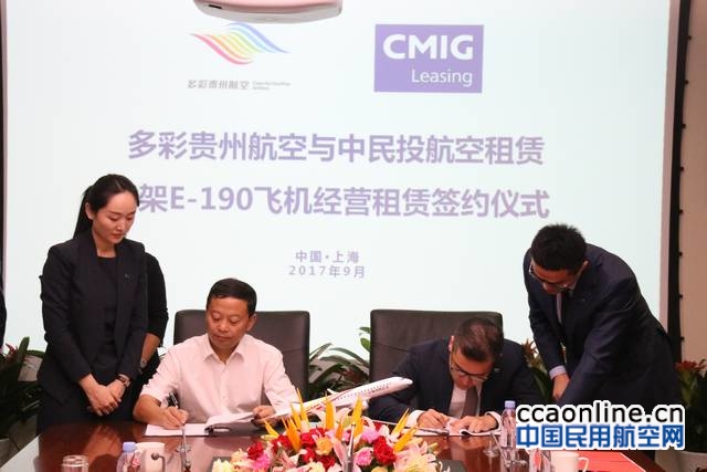 中国民用航空网通讯员王战志讯:9月15日,多彩贵州航空与中国民生投资集团旗下中民投融资租赁有限公司(以下简称“中民投租赁”)在上海签署两架E-190飞机经营性租赁协议,此协议的签署将助推多彩贵州航空抢抓机遇,加快运力投放,实现快速发展。