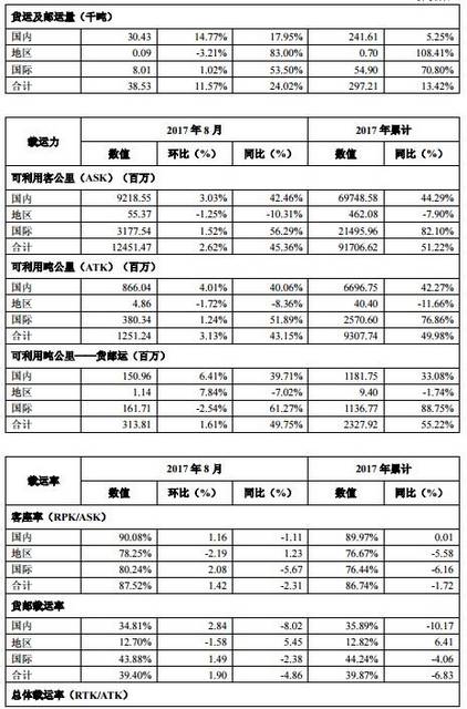 2017年8月,海南航空控股股份有限公司(以下简称“本公司”)及所属子公司(以下简称“本集团”)合并主要运营数据如下: