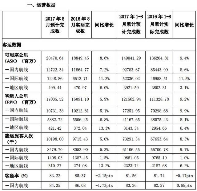 三、经营数据简要说明客运方面,2017年8月,公司客运运力投入(按可用座公里计)同比上升8.6%;旅客周转量(按客运人公里计)同比上升5.9%;客座率为83.22%,同比下降2.15个百分点。