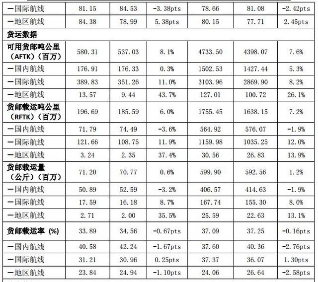 货运方面,2017年8月公司货运运力投入(按可用货邮吨公里计)同比上升8.1%;货邮周转量(按货邮载运吨公里计)同比上升6%;货邮载运率为33.9%,同比下降0.67个百分点。