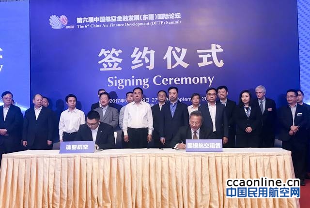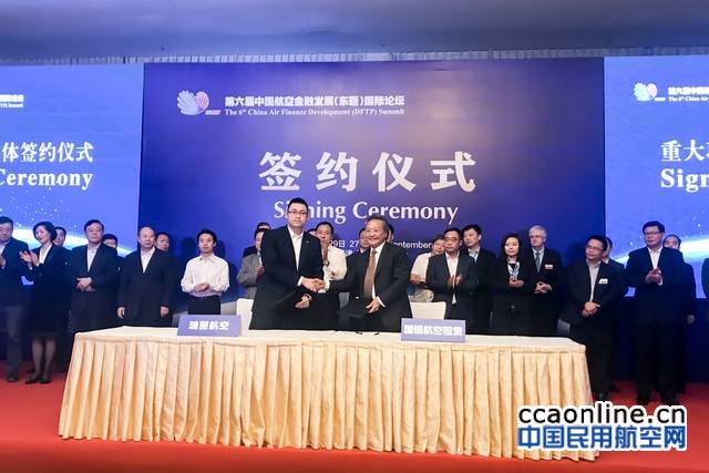 中国民用航空网讯:9月28日,在第六届中国航空金融发展(东疆)国际论坛上,国银航空金融租赁(简称“国银航空”)与瑞丽航空有限公司(简称“瑞丽航空”)在天津市市委常委、滨海新区区委书记宗国英以及其他天津市政府领导的见证下,举行了三架B737-800飞机租赁协议的签约仪式,国银航空总裁兼首席执行官Peter Chang和瑞丽航空母公司云南景成集团总裁董世杰出席了本次仪式。上述飞机将于2018年交付,总金额约1.8亿美元。