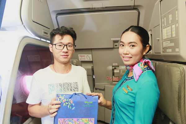 为了纪念这一特殊日子,澜湄航空精心策划,在地面和空中分别举行了首航庆祝活动,为每一位旅客送上乘机惊喜。在西哈努克港、澳门、科罗尔三地航站楼,工作人员将定制明信片、围巾、免费手机卡等首航纪念品派发给旅客。在万米高空的客舱里,乘务组将这份惊喜延续。免费机票、空乘丝巾、飞机模型、定制毛毯和U盘被幸运旅客收入囊中,客舱瞬间变成欢乐的海洋。
