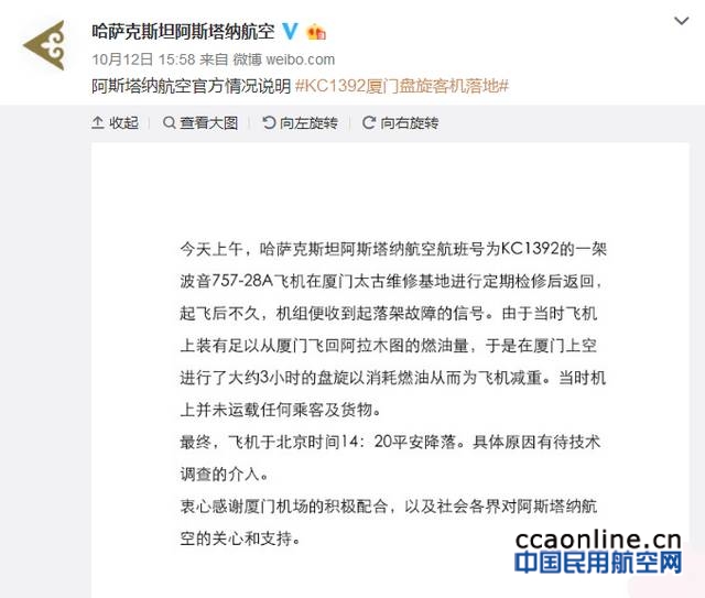 阿斯塔纳航空官方通报