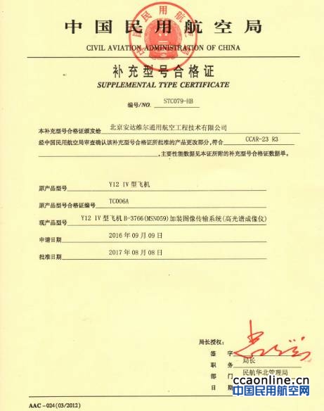 中国民用航空网讯:近日,北京安达维尔通用航空工程技术有限公司(Andawell)获批民航华北地区管理局颁发的“Y12 IV型飞机加装图像传输系统(高光谱成像仪)”STC证书。