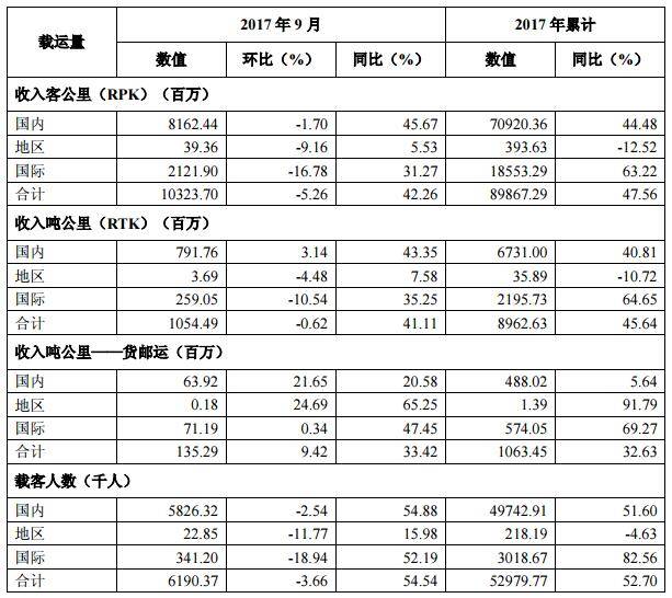 2017年9月,海南航空控股股份有限公司(以下简称“本公司”)及所属子公司(以下简称“本集团”)合并主要运营数据如下: