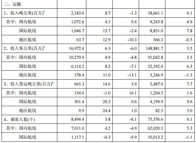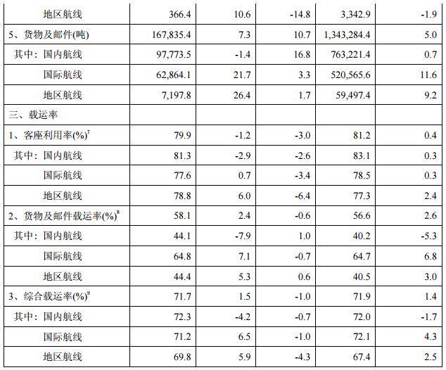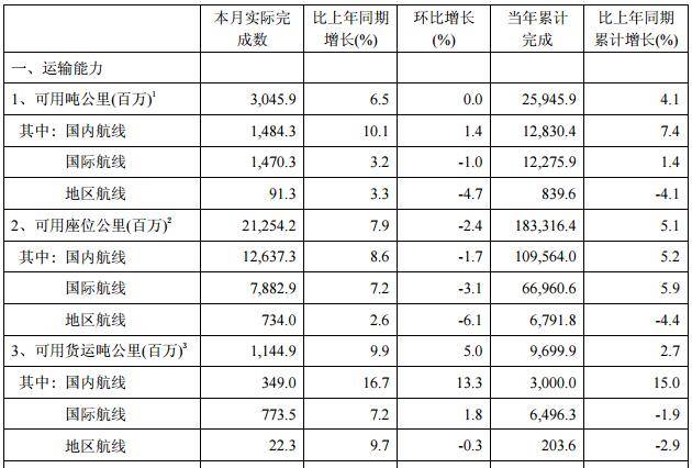 3、可用货运吨公里指飞行公里乘以可载货物及邮件吨位数量