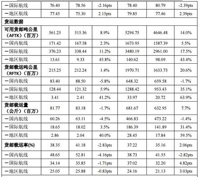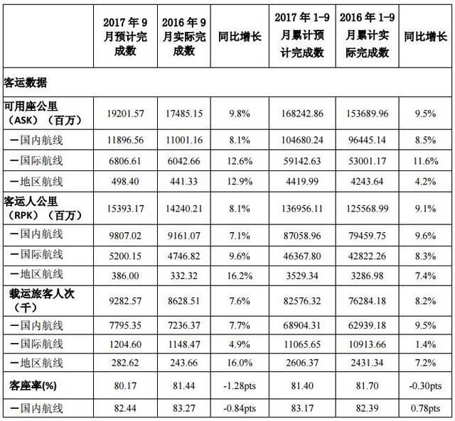 客运方面,2017年9月,公司客运运力投入(按可用座公里计)同比上升9.8%;旅客周转量(按客运人公里计)同比上升8.1%;客座率为80.17%,同比下降1.28个百分点。