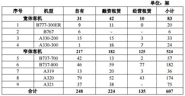 因公司于2017年2月初完成向东航产投转让东航物流100%股权,公司机队数据不再包含东航物流下属控股子公司中货航运营的货机数据。截至2017年9月末,公司飞机机队情况如下: