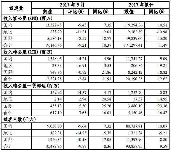 2017年9月,中国南方航空股份有限公司及所属子公司(以下简称“本集团”)客运运力投入(按可利用客公里计)同比上升10.84%,其中国内同比上升8.43%,地区同比下降2.21%,国际同比上升17.65%;旅客周转量(按收入客公里计)同比上升10.37%,其中国内同比上升7.35%,地区同比上升2.01%,国际同比上升18.77%;客座率为80.49%,同比下降0.34个百分点,其中国内同比下降0.82个百分点,地区同比上升3.03个百分点,国际同比上升0.74个百分点。2017年9月15日起,本集团新增重庆-上海虹桥-重庆航线(每周七班);2017年9月26日起,本集团新增广州-科伦坡-马累-科伦坡-广州航线(每周三班);2017年9月27日起,本集团新增广州-万象-广州航线(每周三班);2017年9月28日起,本集团新增深圳—莫斯科—深圳航线(每周两班)。