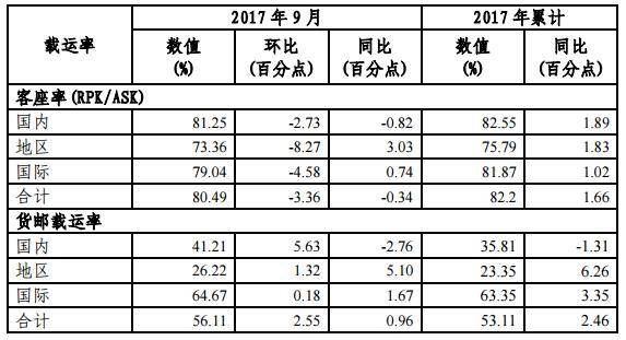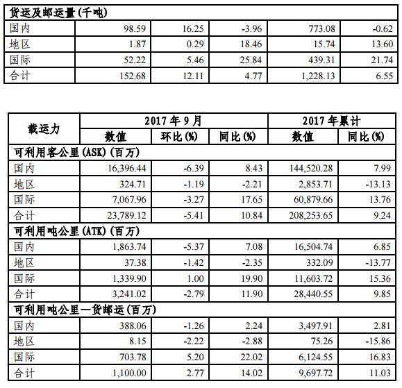 货运方面,2017年9月货运运力投入(按可利用吨公里—货邮运计)同比上升14.02%;货邮周转量(按收入吨公里—货邮运计)同比上升16.01%;货邮载运率为56.11%,同比上升0.96个百分点。