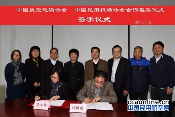 11月6日,中国航空运输协会与中国民用机场协会在京签署合作框架协议,双方对未来合作的内容、机制以及2018年具体合作事项进行了研讨。航协理事长李军、常务副理事长潘亿新,机场协会理事长王瑞萍、专职副理事长覃章高等领导出席,航协秘书长刘树国、机场协会秘书长李小梅分别代表双方签字。