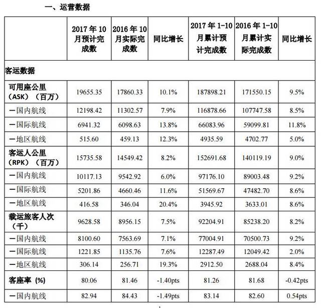 客运方面,2017年10月,公司客运运力投入(按可用座公里计)同比上升10.1%;旅客周转量(按客运人公里计)同比上升8.2%;客座率为80.06%,同比下降1.4个百分点。