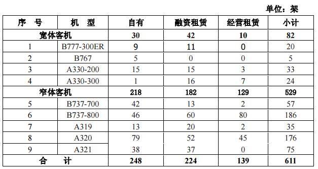 因公司于2017年2月初完成向东航产投转让东航物流100%股权,公司机队数据不再包含东航物流下属控股子公司中货航运营的货机数据。截至2017年10月末,公司飞机机队情况如下: