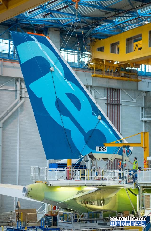 图片说明:首架A330-800的垂直尾翼被安装到后段机身上