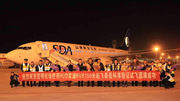 中国民用航空网通讯员倪嘉云、罗睿讯:12月14日凌晨2时,随着山东航空公司一架波音737—800型试飞飞机徐徐降落在昆明长水国际机场的指定停机位,至此,昆明机场圆满完成了使用HUD实施RVR150米起飞最低标准验证试飞任务。云南民航监管局、民航云南空管分局、昆明机场等单位的领导以及各单位保障人员在试飞飞机前合影留念,共同见证这一激动人心的时刻。