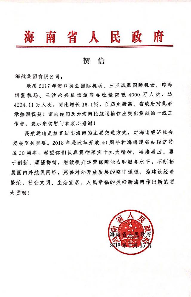 正在高速前进的海航集团再次为自己的历史写出了新的荣光。2018年新年伊始,海航集团收到了来自海南省人民政府的贺信,祝贺海航集团运营管理的四家机场旅客吞吐量首次突破4000万人次,同比增长16.1%,并期勉海航集团在2018年再接再厉,为建设经济繁荣、社会文明、生态宜居、人民幸福的美好新海南作出新的更大贡献。此份荣耀是省政府对海航集团长期以来为海南经济社会发展所作出的贡献的极大肯定。