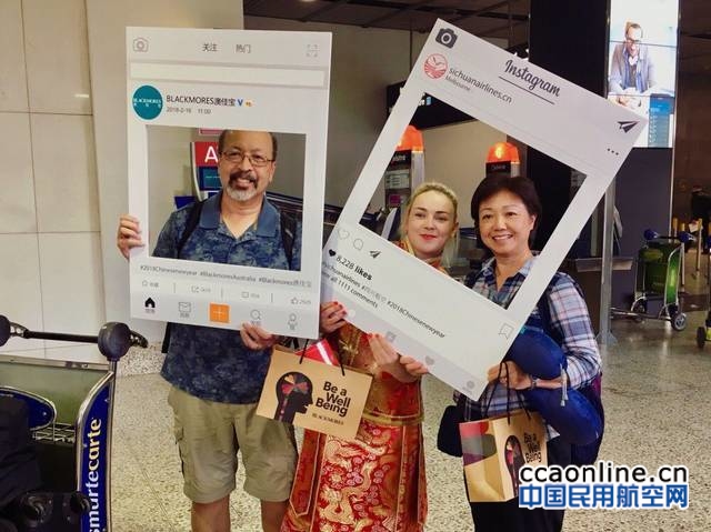 旅客们手持川航Instagram相框与“熊猫人”互动并合影留念,许多旅客还发送微博送出新年寄语。其他航企的代表也来到川航航班值机区前与旅客们共庆新春。