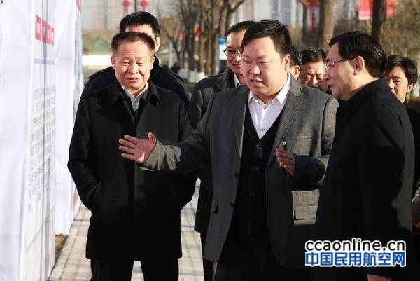 京东集团副总裁、X事业部总裁肖军(右二)向陕西省委书记胡和平(右一)介绍京东智慧物流开展情况及布局规划。