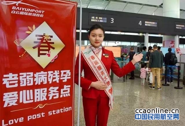 2018春运,白云机场特别开展了以“春风行动 情暖旅途”为主题的“春风服务”系列活动。在安检、问询、值机等岗位设立了80多个“春风服务示范岗” ,以及多个“老弱病残孕爱心服务点”、“春运特殊货物绿色通道”等。