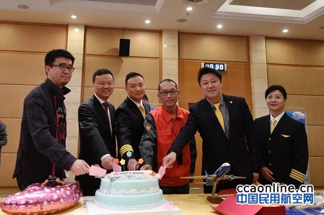 海南航空副总裁余超杰(左二)、大新华航空安全总监栾荣荣(右一)、飞行部总经理阎波(右二)等现场嘉宾共同切下蛋糕,纪念海南航空波音767飞机退役 摄影:陶冉
