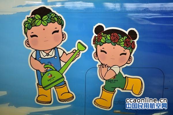 机身尾部的两侧分别绘有两个卡通人物,他们是世园会的吉祥物“小萌芽”和“小萌花”,共8种颜色, Ameco喷漆团队自调了15种颜色。这是Ameco所喷涂的颜色密度最大的卡通图案,每个图案反向包贴要求的精度非常高,误差不超过10微米。为了能让两个小萌娃“活”起来,技术人员还进行了大量的手绘工作。