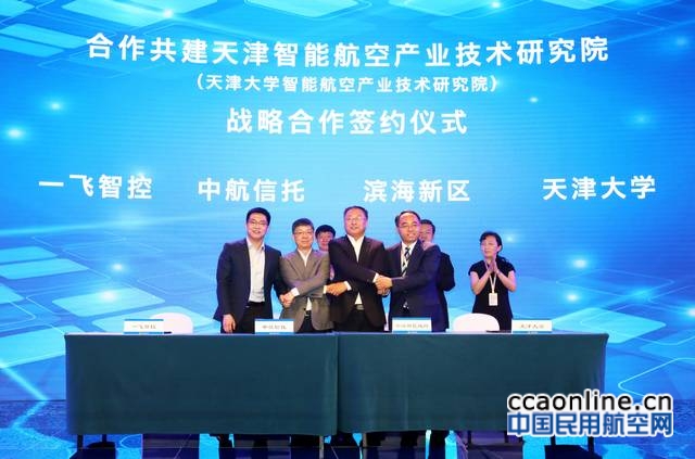 5月17日,天津智能航空产业技术研究院暨天津大学智能航空产业技术研究院战略签约仪式在第二届世界智能大会生态城论坛举行。滨海新区商务委主任纪泽民、中航信托总经理余萌、天津大学副校长胡文平及一飞智控董事长齐俊桐出席并签署战略合作协议。