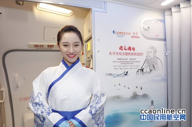 旅客一步入客舱,就感受到浓浓的儒家文化氛围,在舱内的壁板和舷窗位置,张贴了儒家经典《论语》中节选的内容及释义。山航乘务员身穿传统服饰汉服,笑语盈盈在登机口欢迎乘客登机。