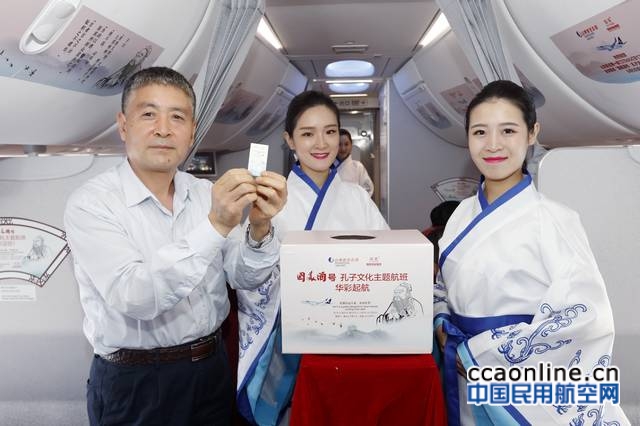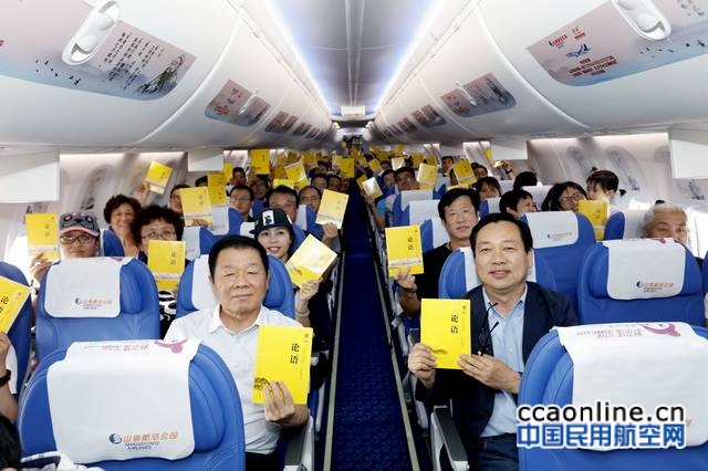 随着飞机转入平飞,航班乘务长蒋绪梁通过客舱广播介绍了本次航班的特色,“成长于孔子故乡的厚道山航,始终以弘扬优秀传统文化为己任,致力于服务好航空主业的同时,让世界看到中国之美。”乘务员为每位旅客都送上了一份“孔子主题航班”首航纪念伴手礼——一本精致的《论语》。